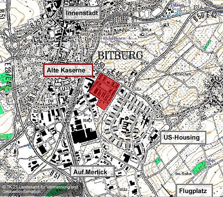 Die Alte Kaserne im Südosten Bitburgs zeichnet sich durch eine sehr gute Lage aus: direkt an der B 50 und am Südring, der seinerseits auf die B 51 und weiter auf die A 60 führt. So gibt es schnelle Verkehrsverbindungen in sämtliche Himmelsrichtungen, aber auch in die Bitburger Innenstadt. Flankiert wird die Alte Kaserne durch die Gewerbe- und Industriegebiete Auf Merlick/Flugplatz und durch die in absehbarer Zeit zur Konversion anstehende US-Housing.